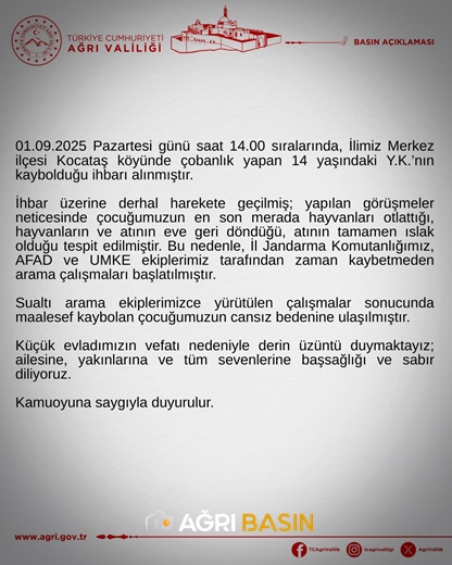 Ağrı Valiliği yaptığı açıklamada, “Evladımızın vefatı nedeniyle derin üzüntü içerisindeyiz. Ailesine, yakınlarına ve tüm sevenlerine başsağlığı ve sabır diliyoruz” ifadelerine yer verdi.
