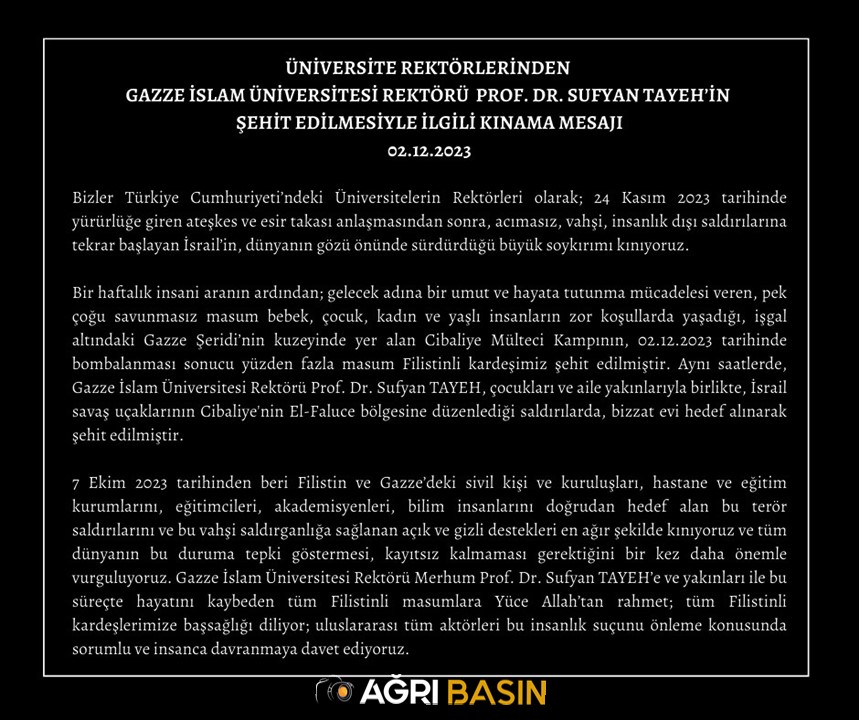 Türkiye'deki Üniversitelerin Rektörlerinden Gazze İslam Üniversitesi Rektörü Prof. Dr. Sufyan Tayeh'in şehit edilmesiyle ilgili kınama mesajı yayınlandı.