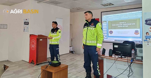 Ağrı’nın Patnos ilçesinde Trafik Jandarması, çiftçilere tarım araçlarını güvenli kullanma ve devrilmelere karşı önlem alma konusunda seminer verdi.